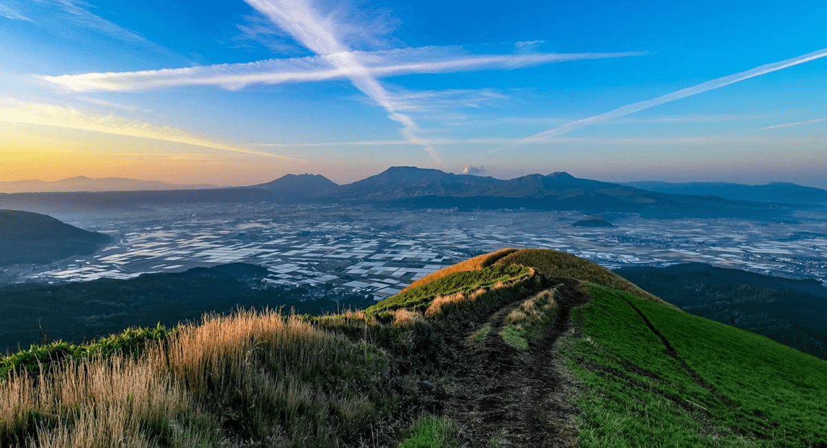 もとは火口だった場所で直径約1kmの阿蘇の山々を一望できるビューポイントの中でも、一番と言われるのがこの大観峰です。目の前に涅槃像(ねはんぞう)として有名な阿蘇五岳が並んでいます。