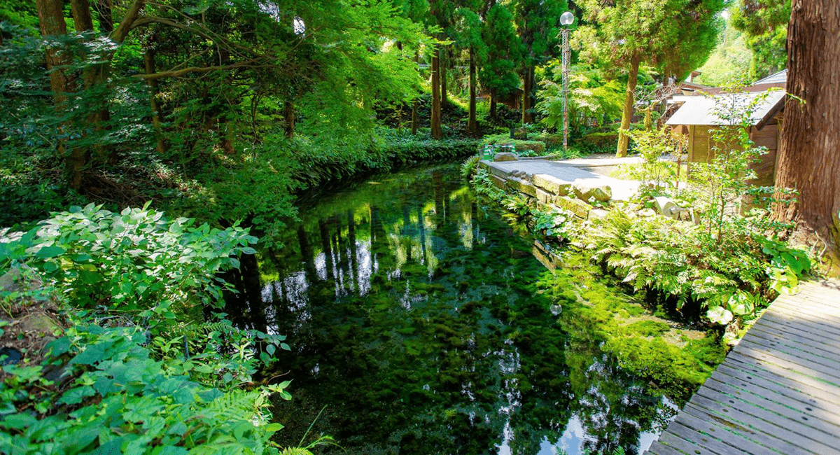 南阿蘇村の旧白水村ある湧水である。「白川吉見神社」境内から年間を通じて14℃、60トン/分の水が湧き出ており、名水百選に選定されている。