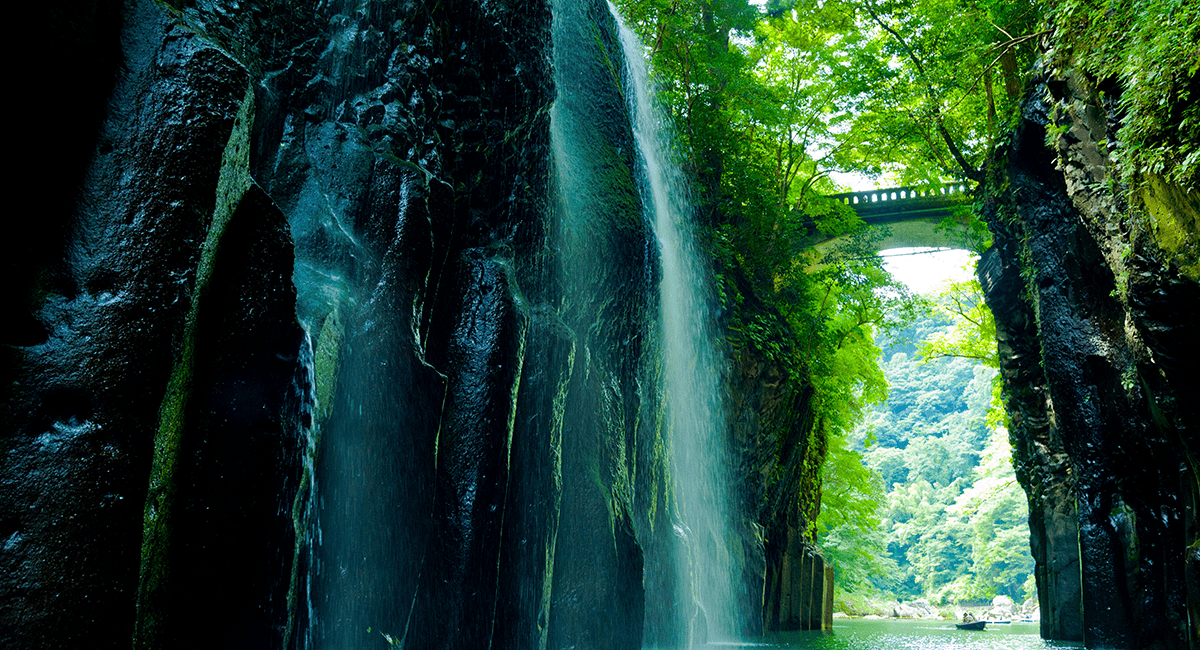 阿蘇の2度に渡る火山活動によって、噴出した溶岩流を五ケ瀬川が浸食して峡谷となったものが高千穂峡。高さ80m~100mにも達する断崖が7kmにわたり続いている。